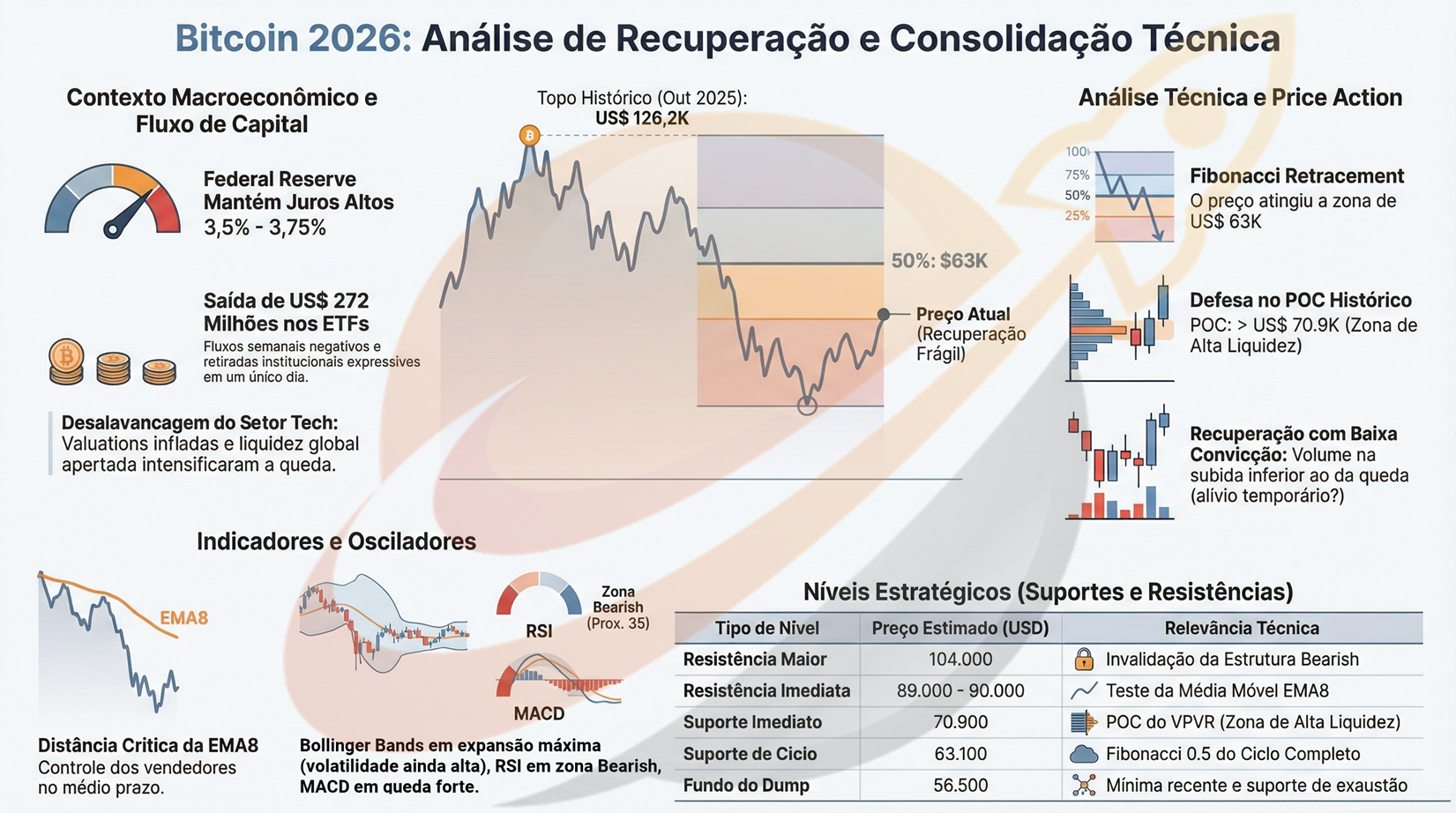 Olhando o gráfico semanal, a estrutura maior permanece claramente baixista. Desde o topo histórico próximo dos 126K formado no final de 2025, o preço desenvolveu uma sequência de topos e fundos descendentes, com cada tentativa de recuperação sendo rapidamente absorvida. A quebra definitiva da região de 90K-92K no início de janeiro confirmou a mudança de caráter (CHOCH) e abriu caminho para a aceleração vista no crash de 5 de fevereiro.
