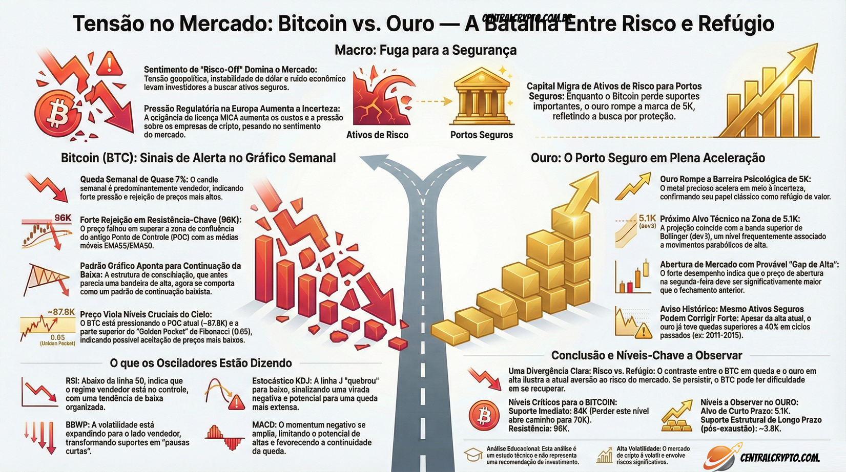 Do outro lado, o ouro está entregando o retrato do risco-off e lembrando que, quando o capital procura proteção, ele costuma ser pouco paciente. O fato do metal estar pressionando o topo do regime de volatilidade e ameaçando abrir a semana com gap reforça a divergência entre “ativo de risco” e “porto seguro”. Se esse contraste persistir, o BTC pode continuar com dificuldade para recuperar 90K rapidamente, exigindo primeiro um suporte “de verdade” para reorganizar o momentum.