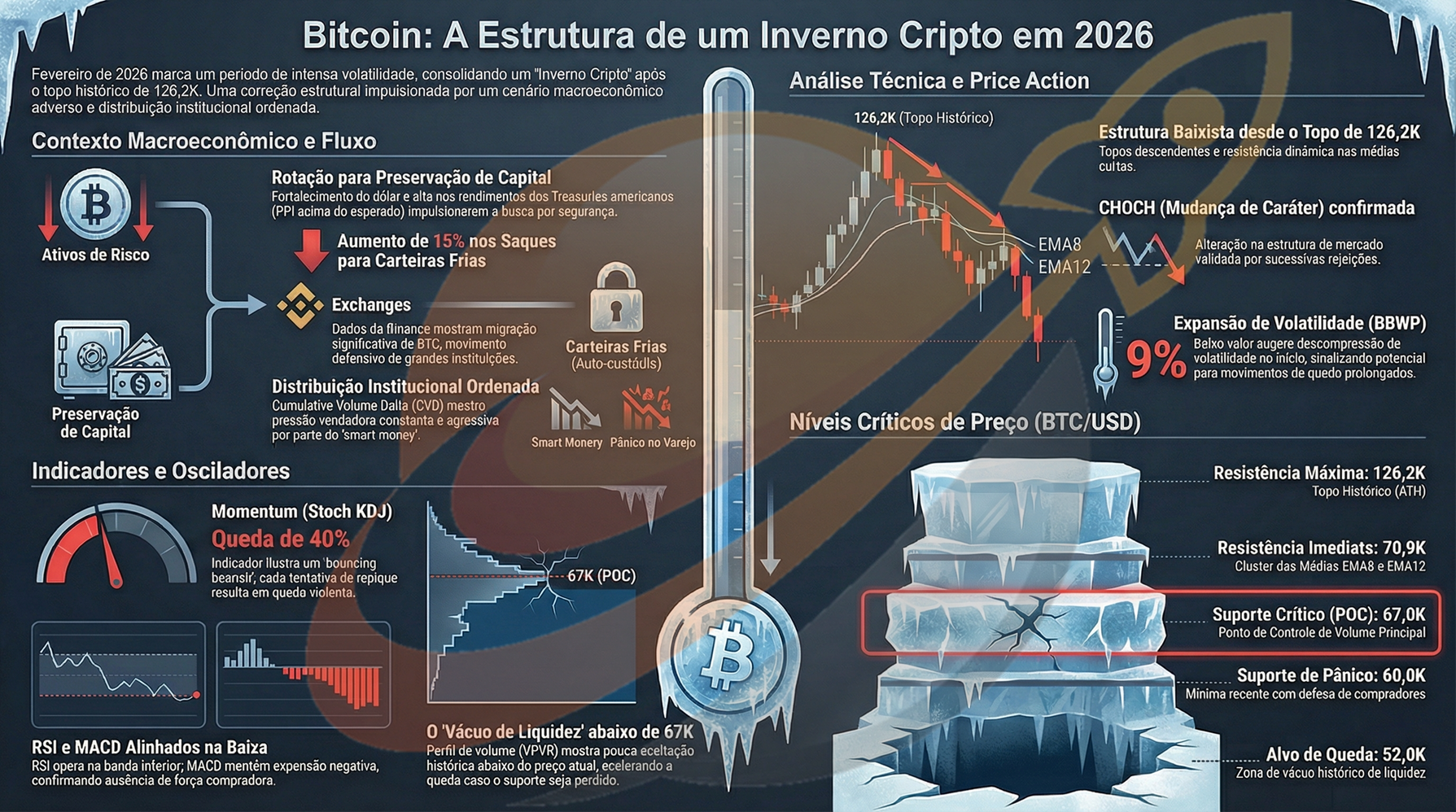 Amarrando macro risk-off, price action de continuação com volatilidade descomprimindo para baixa, volume distribuindo via CVD, osciladores alinhados bearish e ausência de agressão compradora, o cenário dominante aponta extensão do inverno cripto. Fechamento semanal abaixo de POC 67K e nível 0.5 fibo cíclico confirmaria aceleração descendente com alvo em zonas de vácuo inferiores. BTC: Sinais de inverno cripto se intensificam no timeframe semanal segue como leitura realista — preserve capital até sinais claros de reversão.
