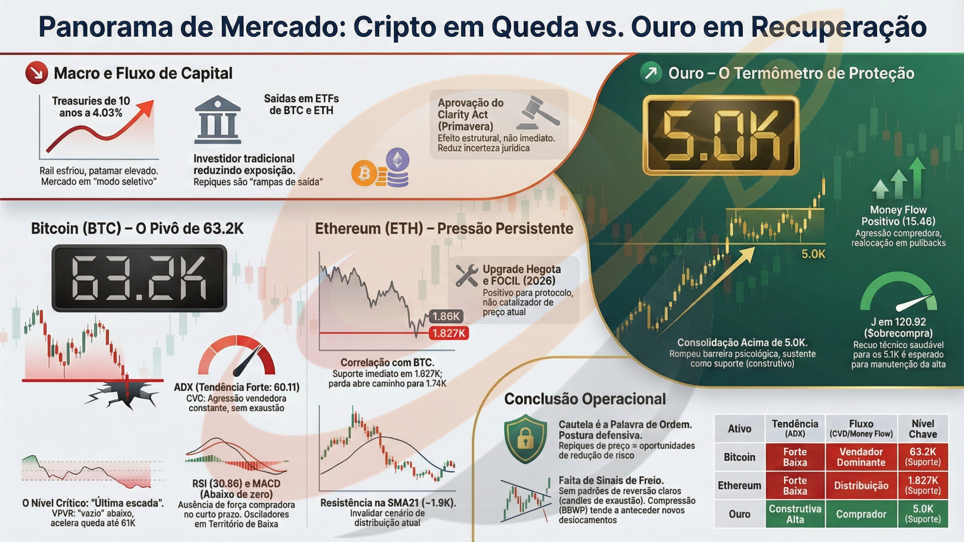 O mercado está num ponto em que técnica e macro finalmente estão falando a mesma língua: cautela. Com yields rondando a região de 4% e o noticiário ainda oscilando entre regulação “promissora, mas lenta” e ambiente global mais sensível a risco, os repiques tendem a ser tratados como oportunidade de redução, não como retomada de tendência. Isso aparece no comportamento do fluxo: enquanto o orderflow continuar predominantemente vendedor e os osciladores permanecerem comprimidos em território defensivo, o preço segue “respondendo” mais a liquidez do que a narrativa.