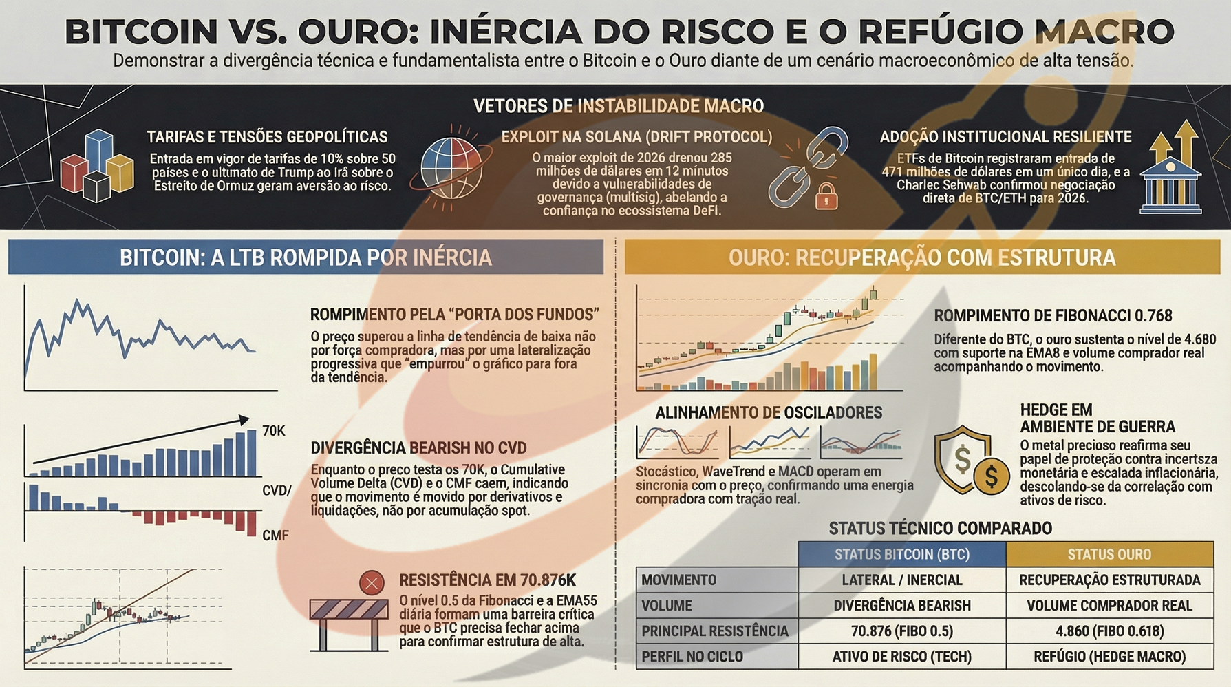 Pegue essa combinação fora de contexto e você tem um setup de compra. Dentro do contexto, é um termômetro partido. Não existe explicação técnica puramente baseada em osciladores para o fato de o BTC não ter saído dos 70K com esse alinhamento de indicadores. A explicação está fora dos gráficos: o mercado não tem comprador estrutural suficiente para sustentar movimento quando a macro está assim. Cada tentativa esbarra no mesmo problema — quem compra agora está comprando contra tarifas que entram em vigor em dias, contra um deadline iraniano que vence amanhã à noite, e contra um Fed que não vai mexer em juros enquanto o petróleo estiver acima de 100 dólares.