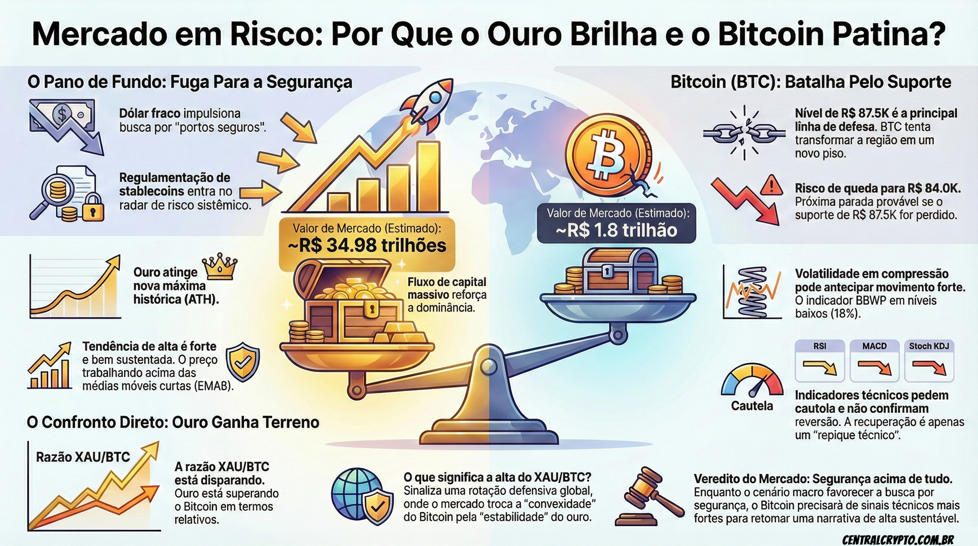 Essa divergência cria um sinal que vale acompanhar: quando ouro sobe por proteção e BTC não acompanha, o que se observa é uma rotação em direção ao “hedge imediato”. Em outras palavras: não é que o Bitcoin deixe de ser reserva; é que, naquele momento, o mercado escolhe a reserva que já vem com manual de instruções pronto.