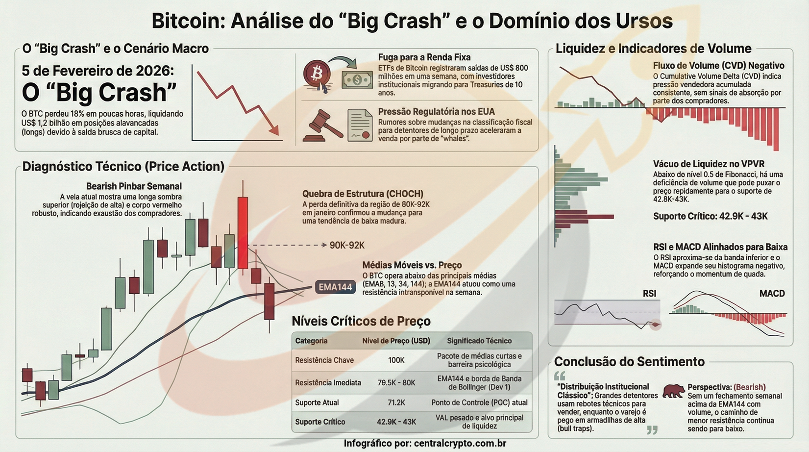 Juntando tudo — macro com liquidez mais restrita e pausa no easing do Fed, outflows institucionais via ETFs, volume assimétrico e price action ainda preso abaixo das médias —, a análise técnica Bitcoin fevereiro 2026 aponta para uma recuperação frágil após a correção profunda. O suporte do POC está funcionando por enquanto, mas sem volume convincente e com os osciladores ainda bearish, o risco de rejeição e continuação da tendência de baixa permanece elevado.